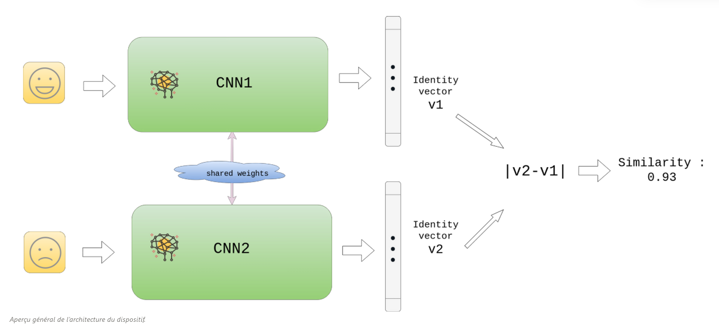 Le cœur du dispositif est quant à lui constitué d’un modèle dont la fonction objectif calcule une similarité permettant de déterminer si deux photographies de visages se réfèrent, ou non, à un même individu.
