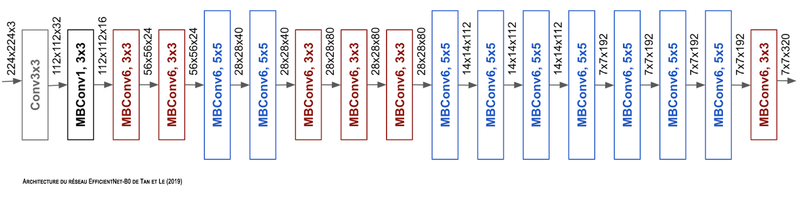 - le EfficientNet-B0 est le fruit d’un domaine de recherche qui tient une place importante en apprentissage profond : le NAS (Neural Architecture Search), et qui a pour objet d automatiser et optimiser les architectures des réseaux utilisés. Il a donné lieu à de nombreux réseaux, dont les plus populaires sont les MobileNets de Howard et al. (2017), EfficientNet (Tan et Le (2019)) ou ConvNext de Liu et al. (2022).
