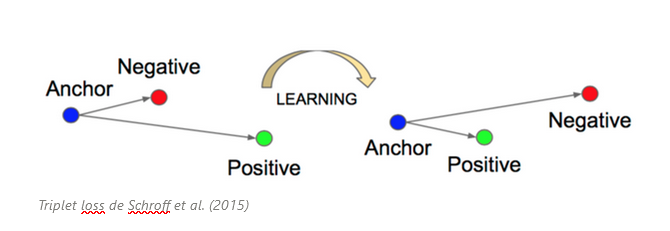 La fonction triplet loss fait quant à elle intervenir un troisième vecteur, “l’ancre”, dans son équation: